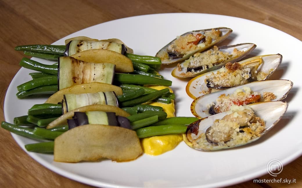 Realizzare gli involtini ponendo dentro ogni fetta di melanzana 5 fagiolini. Sfornare le cozze gratinate.