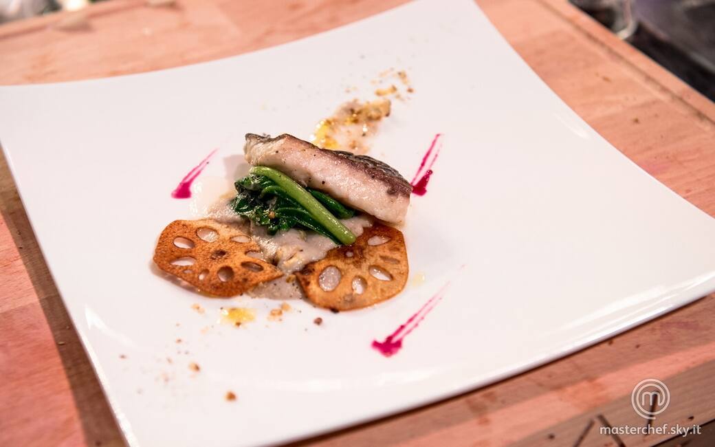 Impiattare versando la crema di radice di loto e posizionando i filetti al centro, concludendo con una guarnizione di noci tritate.