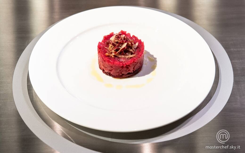 Impiattare con l’ausilio di un ring circolare: disporre la composta di rapa rossa e patata, la tartare e l’insalata di radicchio sopra la carne.