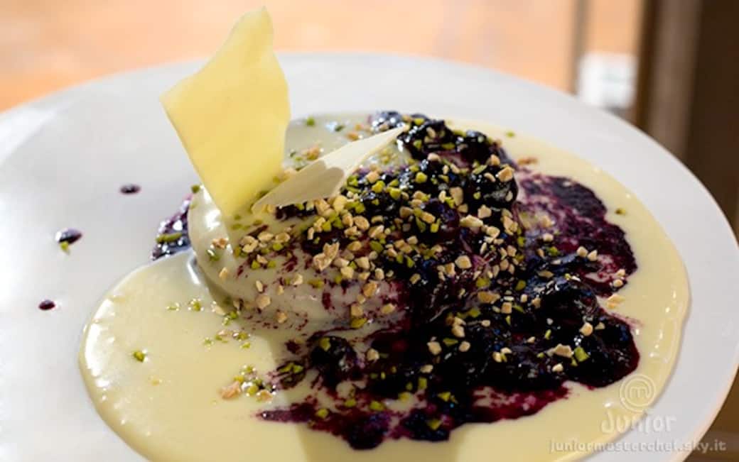 Dacquoise con mousse di cioccolato bianco e salsa di mirtilli