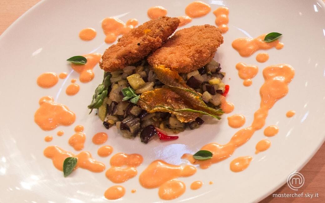 Impiattare disponendo le verdure saltate, i fiori di zucca fritti, i medaglioni di cervello e la maionese al pomodoro intorno. Completare con qualche foglia di maggiorana.