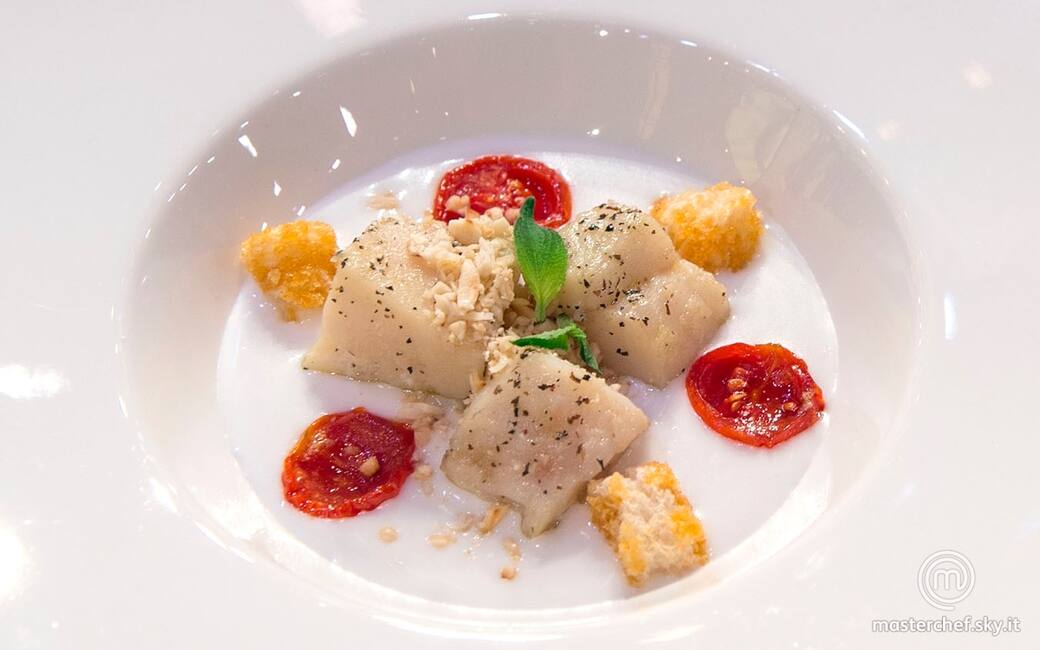 Impiattare versando la crema sul fondo del piatto, i cubi di pesce al centro e i pomodorini e il pane raffermo alternati. Completare spolverando al granella di pinoli.