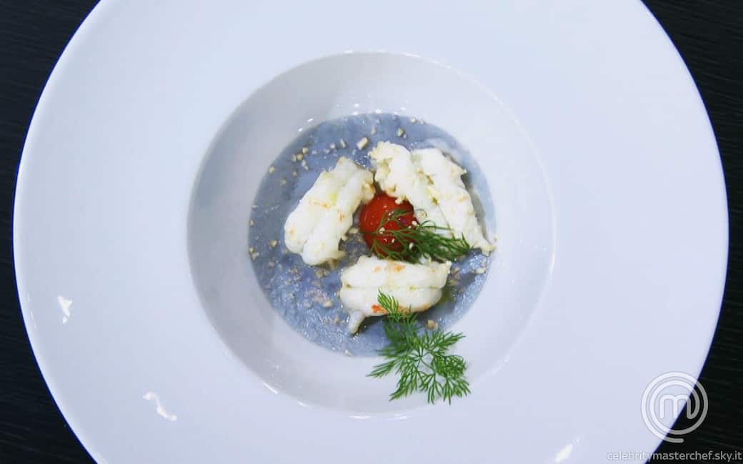 Distribuire la crema di cavolfiore nei piatti, adagiare al centro gli scampi. cospargere con le mandorle tritate, insaporire con un filo d’olio e una macinata di pepe e completare con un pomodorino e una fogliolina di aneto.