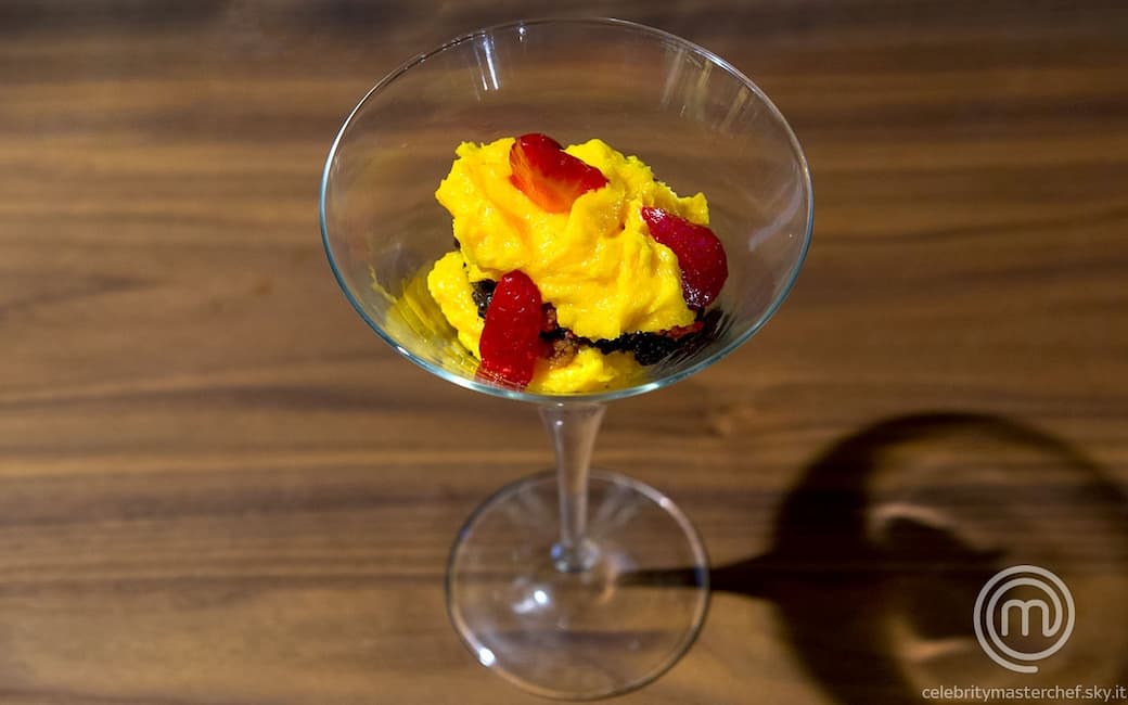 Impiattare in una coppetta da cocktail: disporre alla base il crumble all'alchermes, poi la crema al cioccolato, poi il crumble all’amaretto e alchermes, poi la crema al burro, poi il crumble all’amaretto e alchermes, poi la crema al cioccolato, poi il crumble all'alchermes e poi la crema al burro. decorare con le fettine di fragola e tenere in frigorifero fino al momento di servire.
