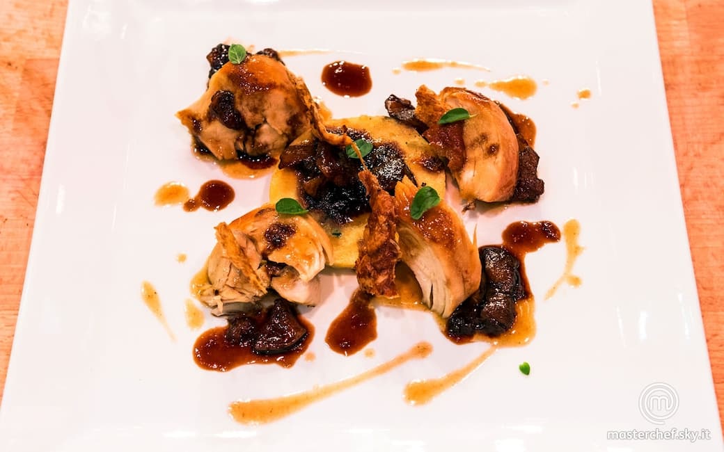 Disporre al centro del piatto il disco di patate, scaloppare il pollo e irrorarlo con il brodo di pollo ridotto. Adagiare le albicocche all’aceto balsamico con la loro salsa, la pelle croccante e completare con qualche foglia di maggiorana.