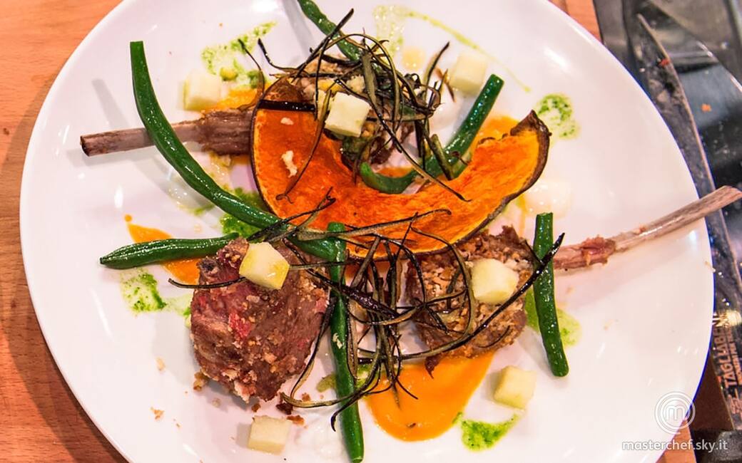 Impiattare disponendo 3 costolette di agnello a raggiera, qualche virgola di crema alla zucca e acqua di spinaci, qualche goccia di yogurt, i cubetti di mela, i fagiolini, la zucca disidratata e la buccia di melanzana fritta.