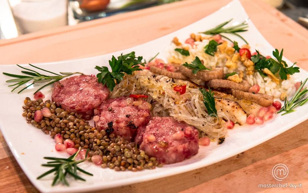 Impiattare su un piatto rettangolare, partendo dal lato corto e realizzando delle strisce con le varie preparazioni: due cucchiai di lenticchie, tre fette di cotechino, due forchettate di noodles, due filetti di orata, quattro fette di loto e tre cucchiai di riso bollito cosparso dei gherigli di noce tritati. Concludere con alcuni chicchi di melagrana e qualche rametto di rosmarino.