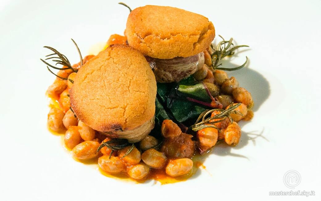 Filetto di maiale in crosta di mostarda e borlotti