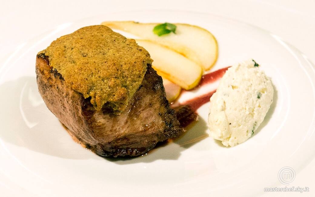 Impiattare versando un cucchiaio di salsa alle pere e al vino rosso. Disporre sopra il filetto, di lato una quenelle di skuta e qualche fetta di pera fritta. Decorare con qualche foglia di salvia ananas.
