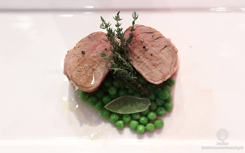 Impiattare con un coppapasta creando un letto di piselli sul quale verranno adagiate due fette di filetto. decorare con una foglia di salvia e dei rametti di rosmarino.