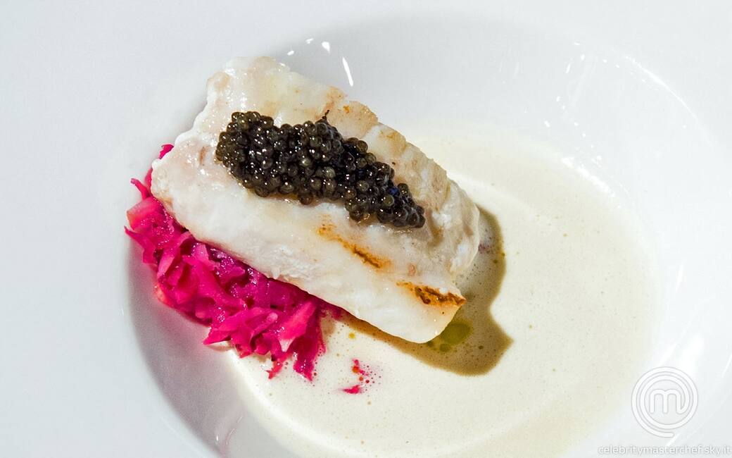 Filetto di San Pietro e caviale, con crauti saltati all'aceto di lamponi su salsa allo zafferano