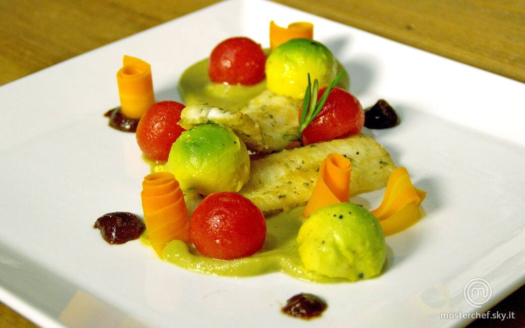 Impiattare disponendo la crema di melanzane e avocado, i filetti di sogliola, i pomodorini, le sfere di avocado e la salsa di prugne. Completare il piatto con dei riccioli di carote.