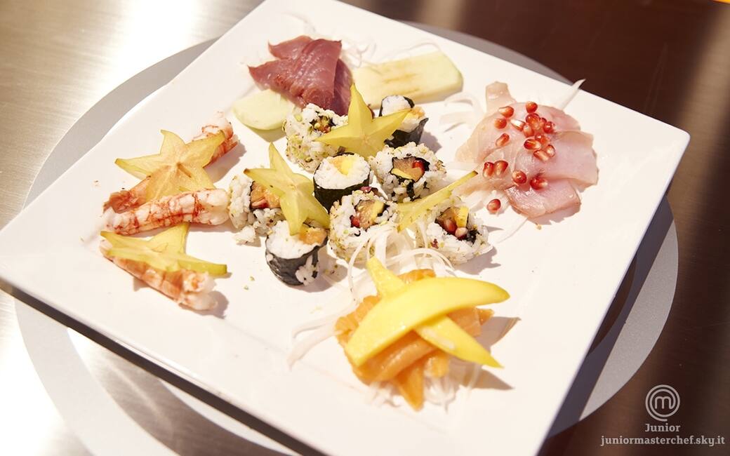 Impiattare i vari maki e uramaki al centro. ai lati servire gli nighiri con le strisce di frutta. ultimare con dei gamberi scottati in padella e dei chicchi di melograno.