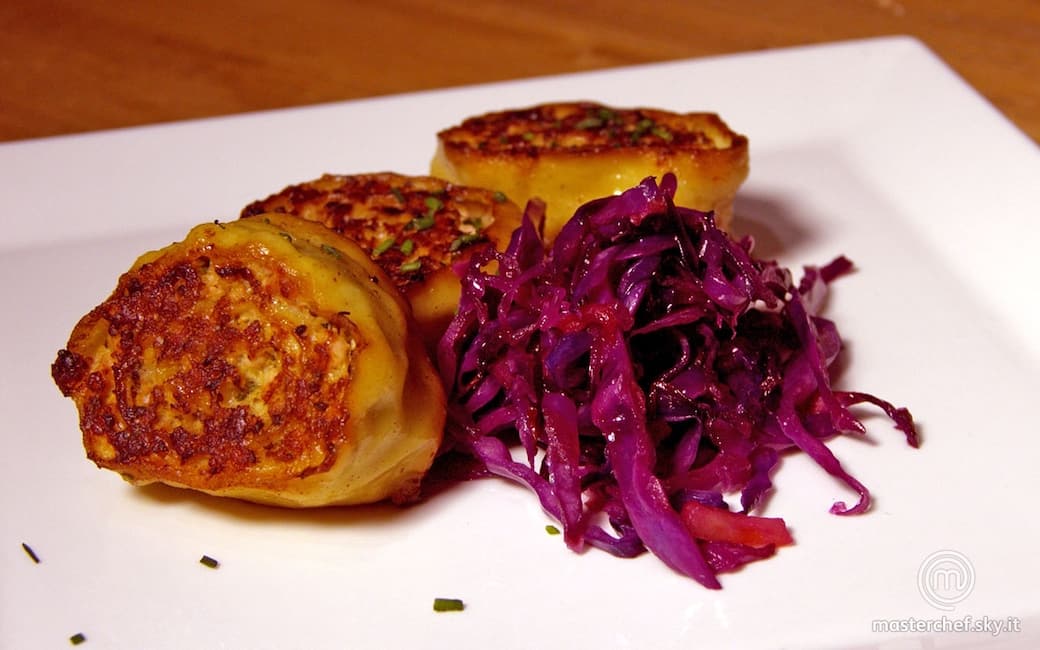In una padella far dorare la restante parte di cipolla tritata con una noce di burro. Tagliare a fettine sottili il cavolo rosso, mettere in padella e sfumare con del vino. Sbucciare la mela, tagliarla a piccolissimi tocchetti e mettere in padella. Aggiungere un po' di zucchero.