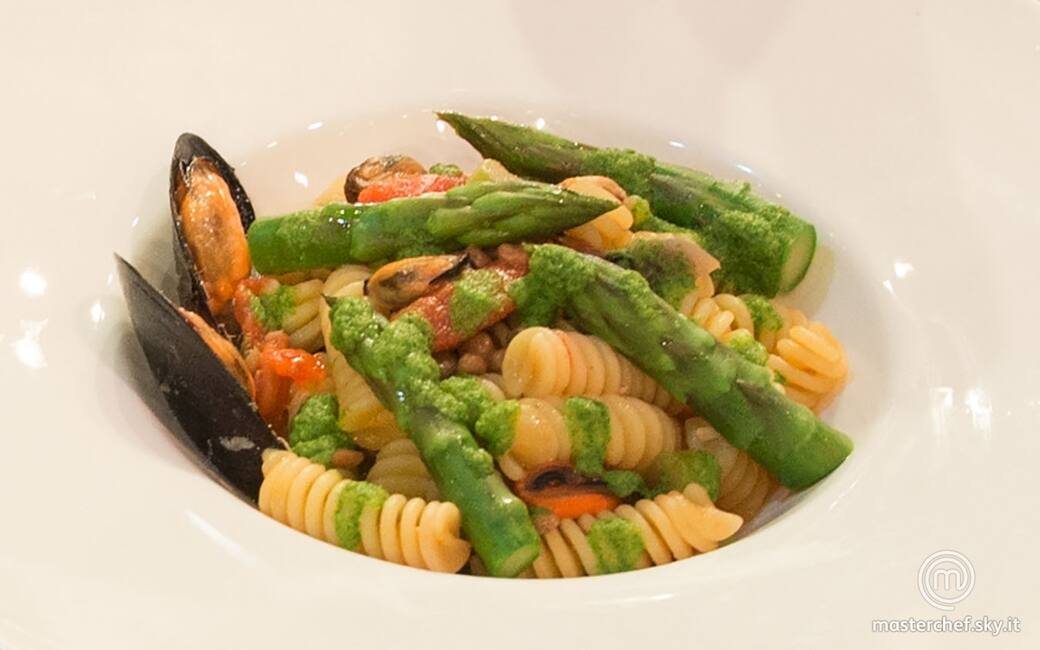 Impiattare i fusilli e completare con le punte degli asparagi, la crema di di lattuga e due cozze lasciate con il guscio. Aggiustare di sale e pepe.