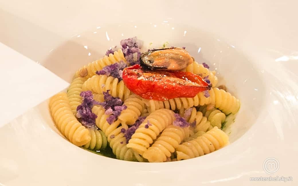 Impiattare versando la lattuga liquida. Adagiare sopra la pasta, la terra di patate viola, un pomodorino confit, una cozza e un filo di olio evo.