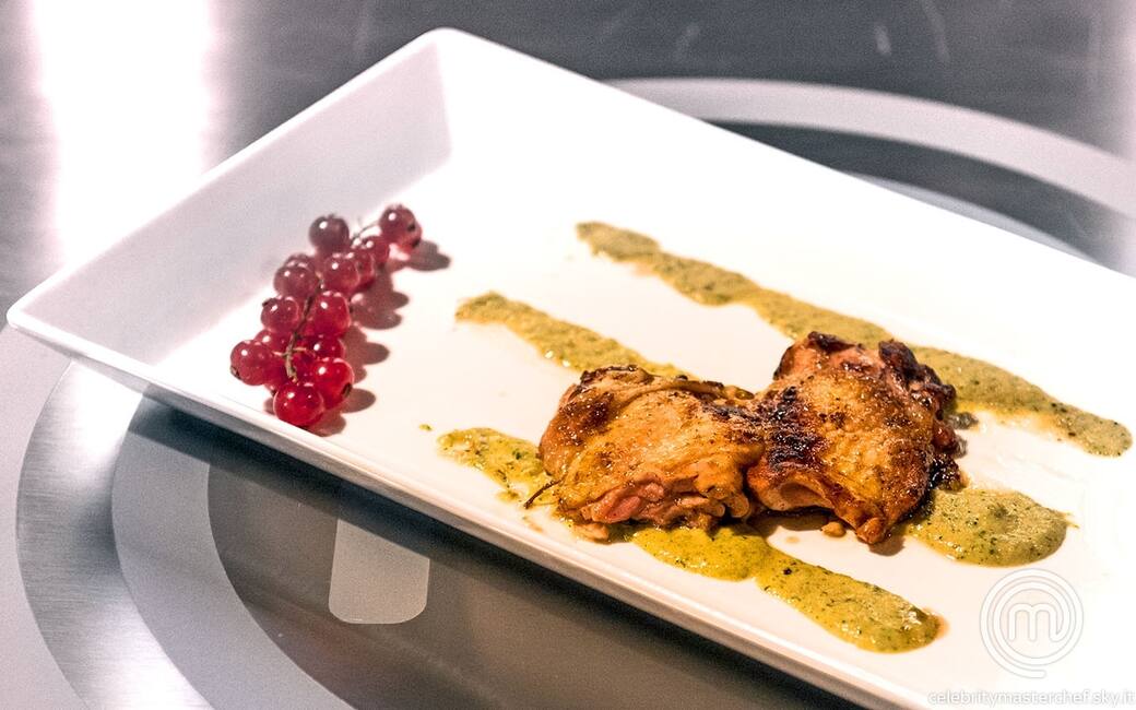Impiattare disponendo tre strisce di crema alle zucchine e adagiare una coscia tagliata. decorare con un rametto di ribes rosso e aggiustare di sale e pepe.