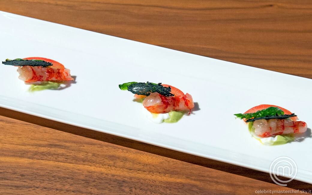 Gamberi rossi marinati e burrata su salsa di avocado e cialda al nero di seppia