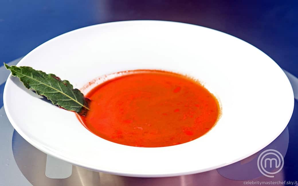 Servire il gazpacho in un piatto fondo e accompagnarlo con il pomodoro, il peperone, la cipolla e il cetriolo a pezzi lasciati da parte. servire con una foglia di alloro e i cubetti di pane raffermo.