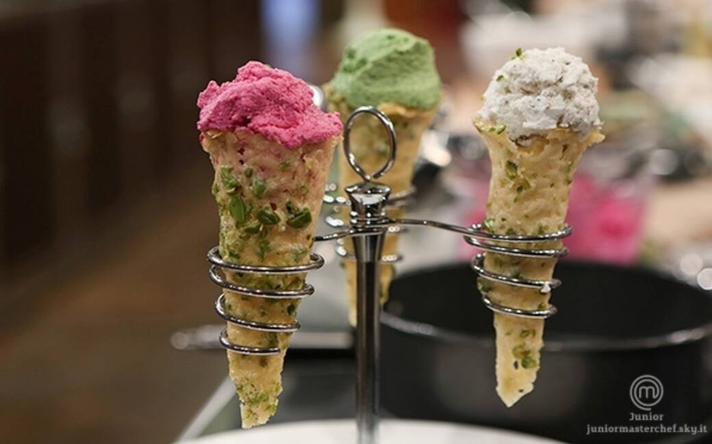 Preparare il gelato rosa: frullare la barbabietola con un filo d'olio, sale e pepe. una volta pronto unire con la ricotta e girare bene. per il gelato verde frullare basilico e qualche foglia di prezzemolo con olio sale un po' di parmigiano, unirlo alla ricotta e girare bene. preparare il gelato stracciatella: prendere il tartufo e grattugiarlo insieme alla ricotta, aggiungere sale e pepe.