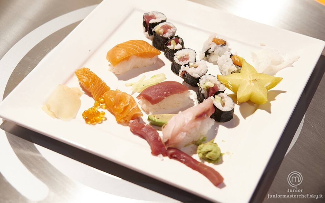 Per i nighiri: con il riso fare dei parallelepipedi lunghi circa 5 centimetri e alti circa 3 centimetri. tagliare il pesce della stessa lunghezza e larghezza del parallelepipedo, altezza circa 7 millimetri. adagiarvi sopra il pesce tagliato.