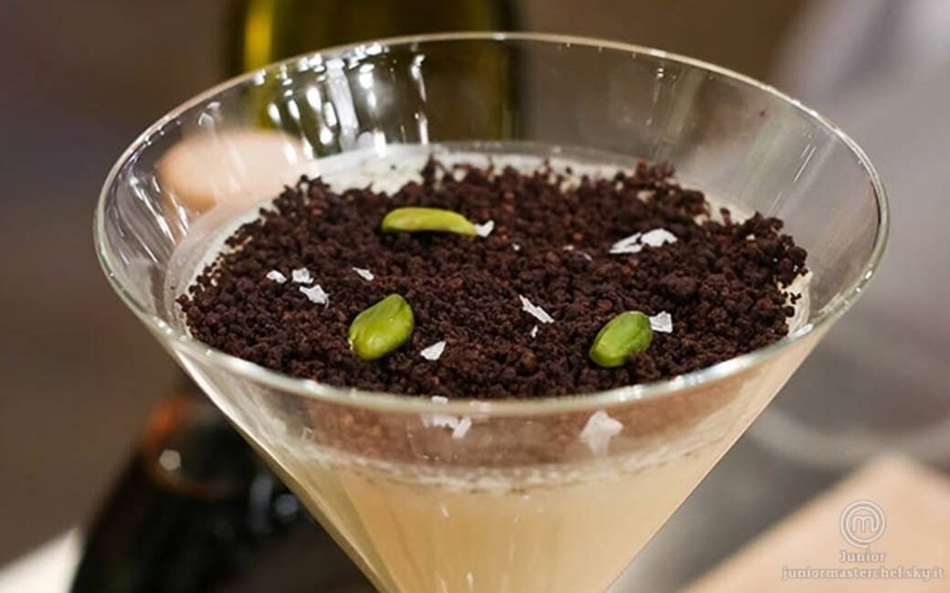 Lasciare raffreddare le briciole che dovranno essere croccanti e metterle sul bicchiere pieno di crema. aggiungere un paio di fiocchi di sale maldon sulla superficie.