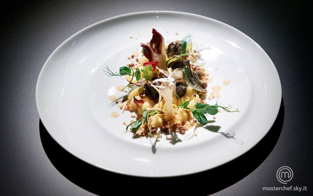 Comporre il piatto e decorare con acetosella, germogli di pisello, funghi, fiori eduli e erbe aromatiche (timo, erba cipollina, aneto).