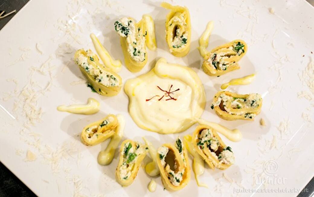 Sfornare le crepes, tagliarle a fette di 3 cm e disporle a forma di fiore su un piatto piano. al centro versare la besciamella e decorare con qualche pistillo di zafferano.