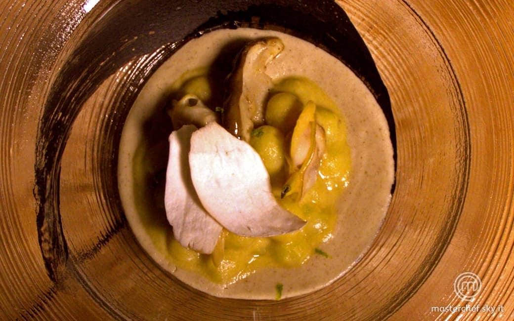 Disegnare una spirale sul piatto con il nero di seppia, sporcando anche il bordo; disporre la crema di funghi a specchio, sopra gli gnocchi mantecati con la crema di vongole e patate, aggiungere alcune vongole intere ed eventualmente il cappello dei porcini tenuto da parte. Finire tagliando veli di funghi a crudo con la mandolina, aggiustando con una macinata di pepe e grattando della scorza di lime.
