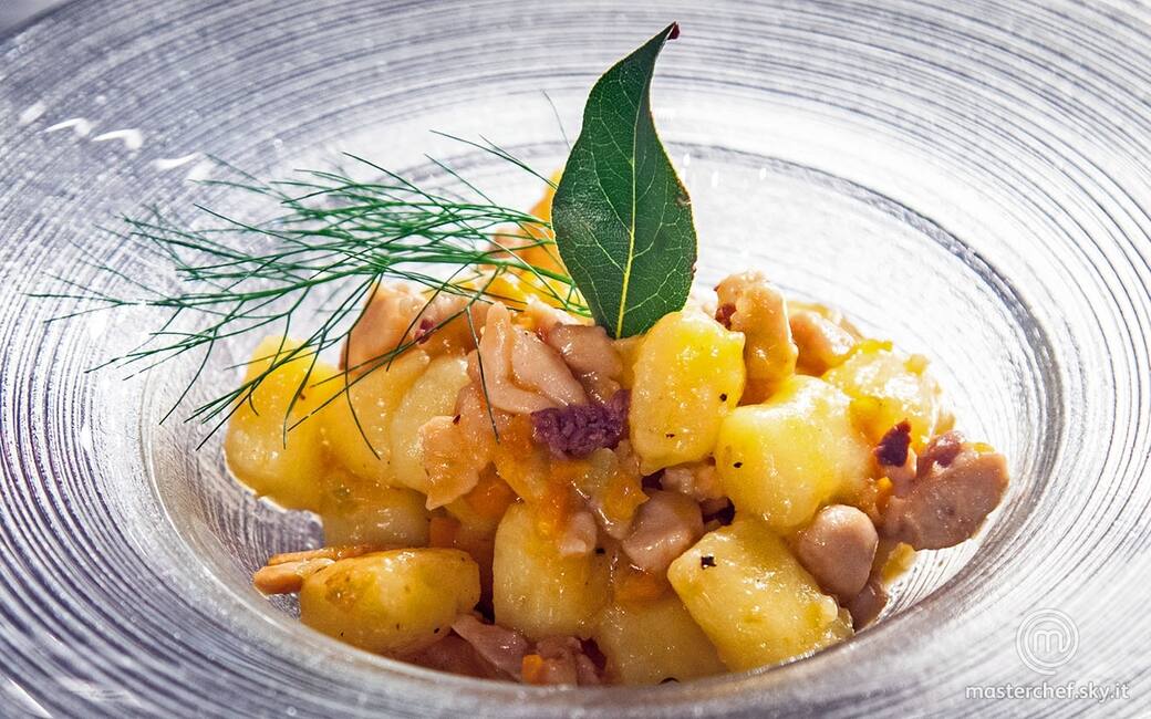 Una volta cotto il coniglio, rimuoverlo dalla pentola e disossarlo privandolo delle ossa più piccole. Tagliare la carne al coltello fino ad ottenere un ragù grossolano e rimetterlo nel proprio fondo di cottura, aggiungendo brodo di carne se necessario. Portare a ebollizione abbondante acqua salata in una pentola, lessare gli gnocchi fino a quando non risalgono, scolarli e mantecarli nel ragù bianco di coniglio.