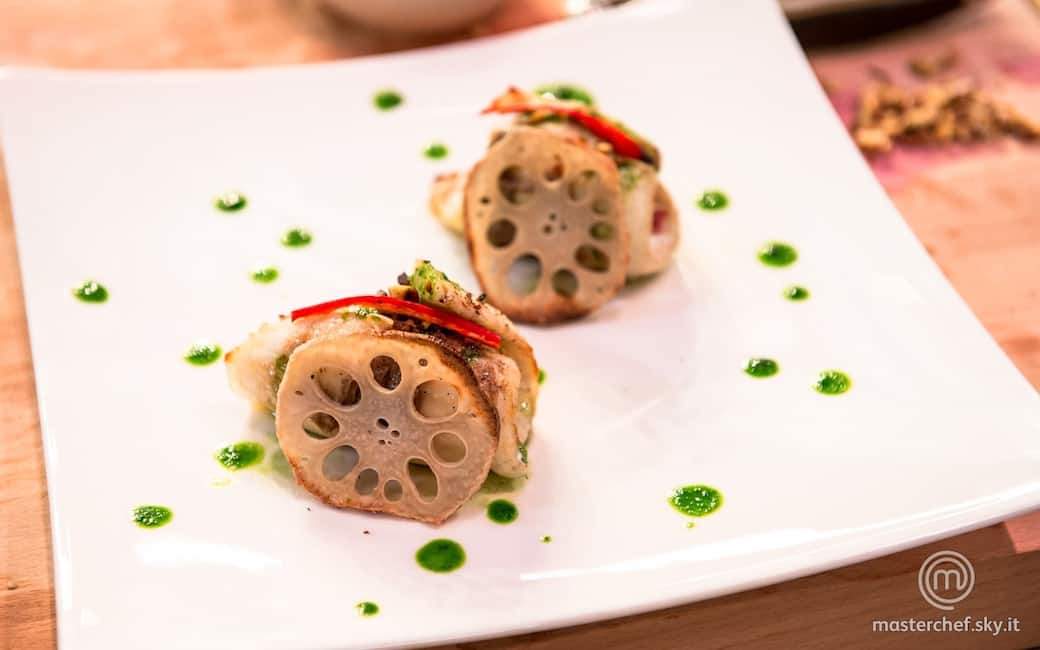 Impiattare adagiando due involtini su un piatto piano, completando con alcune gocce di salsa e guarnendo con due fette di radice di loto croccanti e una spolverata di noci tritate.