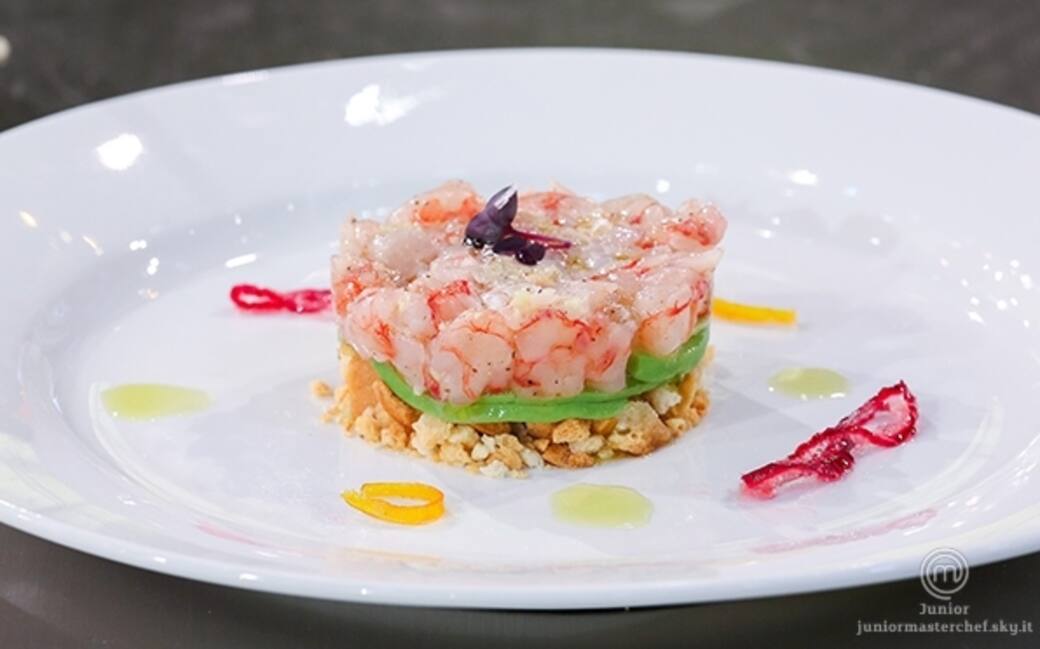 Sgusciare i gamberi, tagliarli a cubetti e marinarli in succo d'arancia, lime, olio e sale.