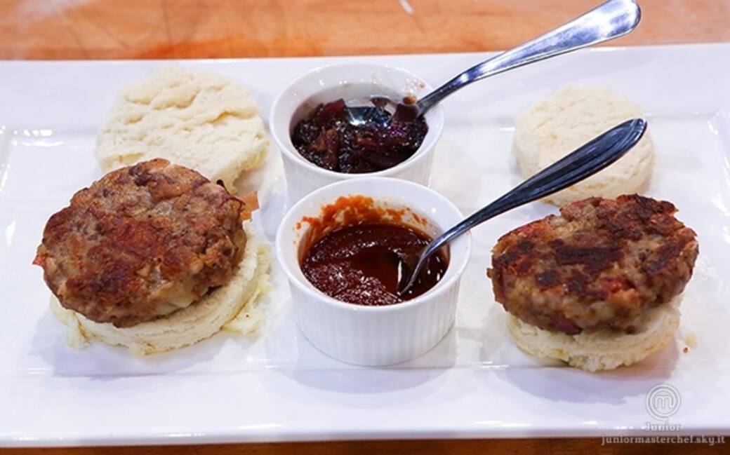 Su un piatto disporre in modo in modo sequenziale: forma base focaccia, hamburger, cipolle e forma superiore focaccia cosparsa di foglie di rosmarino. accanto all'hamburger posizionare la brocchetta contenente il ketchup.