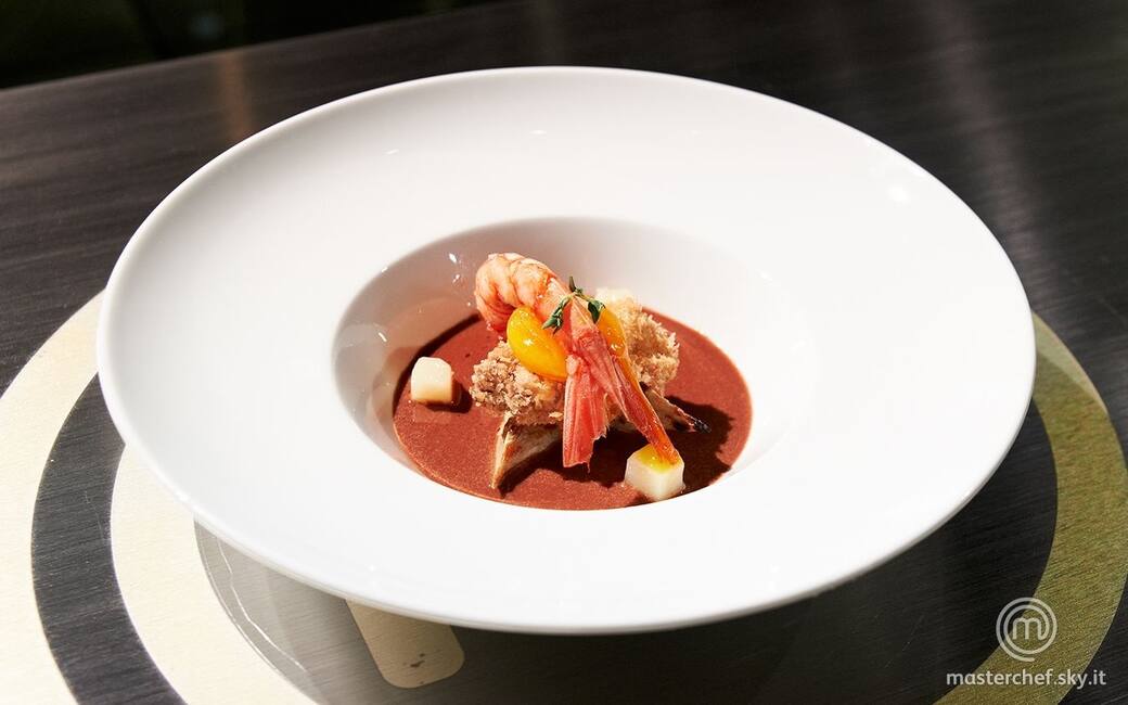 Versare sul fondo di un piatto la bisque al cioccolato, aggiungere i carciofi piastrati. Ai lati sistemare i cubetti di patata, al centro il cervello fritto, il tuorlo marinato e il gambero. Terminare con timo fresco.