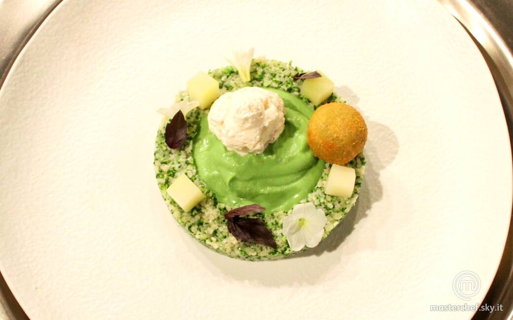 Per la finitura e il montaggio del piatto: fare un soffritto con olio e aglio, saltare e salare metà dei ciuffetti di broccolo con la rimanenza del cous cous usato per la polpetta. Mettere nel piatto due coppapasta di diametro diverso, versare il cous cous appena saltato, la crema di broccoli e deporre al centro la spuma di bagnacauda. Adagiare la polpetta fritta e decorare con i cubetti di torsolo dei broccoli, i fiori e i germogli di crescione.