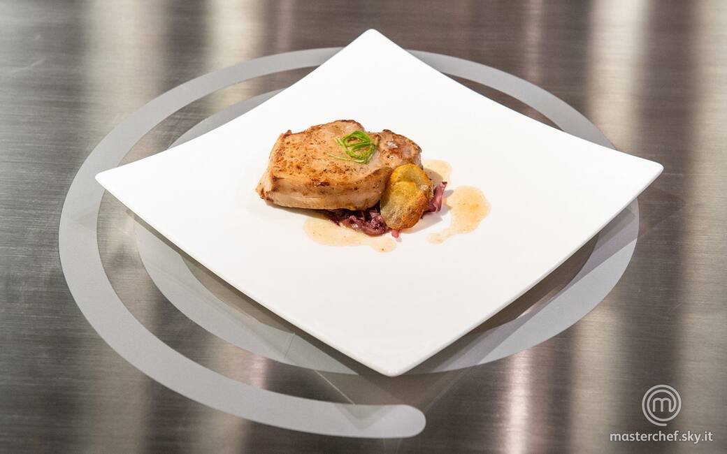 Impiattare disponendo il contorno di radicchio e cipolla in una ring circolare. Adagiare la lonza di maiale e le chips di patate, condire con la deglassatura e la foglia di rapa bianca e completare con una spolverata di fiocchi di sale e una macinata di pepe.