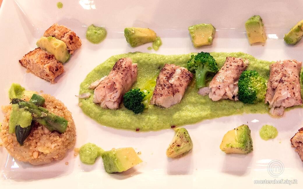 Impiattare versando la crema di asparagi su un piatto rettangolare e adagiarvi sopra il filetto di pesce. Disporre l’insalata di quinoa con l’ausilio di un ring circolare e decorare con le punte degli asparagi, le sacche di uova ai lati corti del piatto con qualche cubetto di avocado, le cime di broccoli e qualche goccia di crema di asparagi.