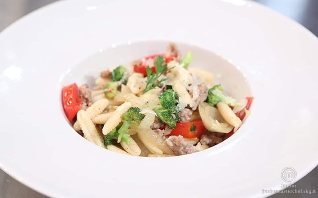 Far bollire l'acqua per i malloreddus. in una padella far soffriggere olio, cipolla tritata e aggiungere i broccoli, 1/2 bicchiere di vino bianco; cuocere a fiamma bassa per 3 minuti circa, dopo aggiungere la salsiccia sbriciolata, coprire con coperchio e far cuocere per altri 5/7 minuti. aggiungere i pomodorini tagliati a meta e dopo 2 minuti spegnere il fuoco.