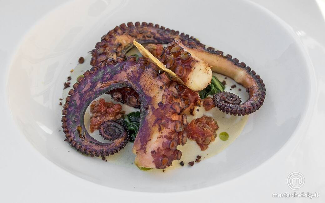 Impiattare versando uno specchio di crema in un piatto fondo. Posizionare 3 tentacoli al centro e, nel loro ricciolo interno, 3 cucchiai di battuto ai pomodorini. Spennellare i tentacoli con l’emulsione al prezzemolo, cospargere con il crumble di olive e posizionare una cialda di Canestrato per piatto. Completare decorando con qualche goccia di emulsione al prezzemolo e aggiustare di sale e pepe.