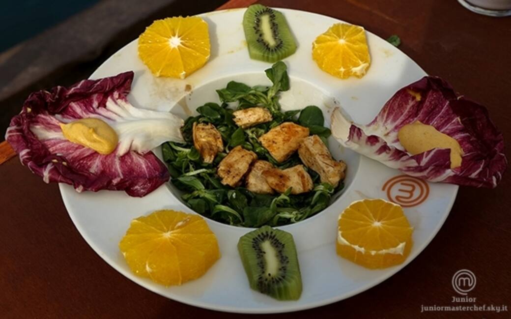 Marinare velocemente il petto di pollo con olio, sale e pepe. cuocerlo successivamente sulla piastra e tagliarlo a strisce diagonali. a parte, sbucciare e tagliare a fettine i kiwi e l'arancia. riunire tutti gli ingredienti in un'insalatiera capiente: il pollo, la frutta, il radicchio tagliato a pezzi e la valeriana.