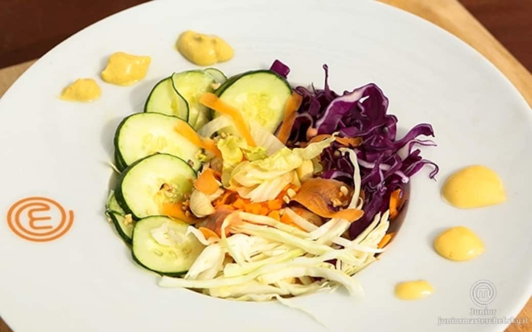 Insalatina di pollo arrostito con foresta di verdure e maionese alla vaniglia