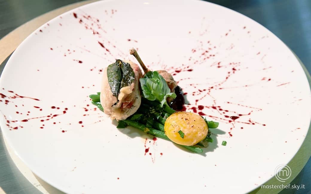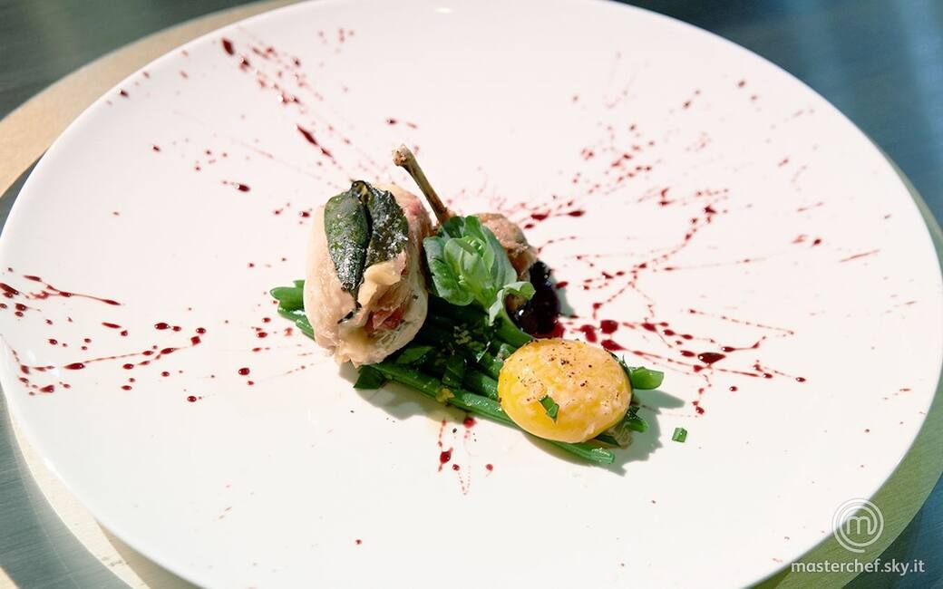 Impiattare disponendo al centro del piatto un cucchiaio di riduzione al vino rosso e schiacciarla per realizzare degli schizzi. Disporre il petto farcito, la coscia di quaglia, i fagiolini e sopra il tuorlo. Cospargerlo con poco pecorino e gratinare con l’ausilio di un cannello. Decorare con foglie di erba ostrica e aggiustare di sale e pepe.