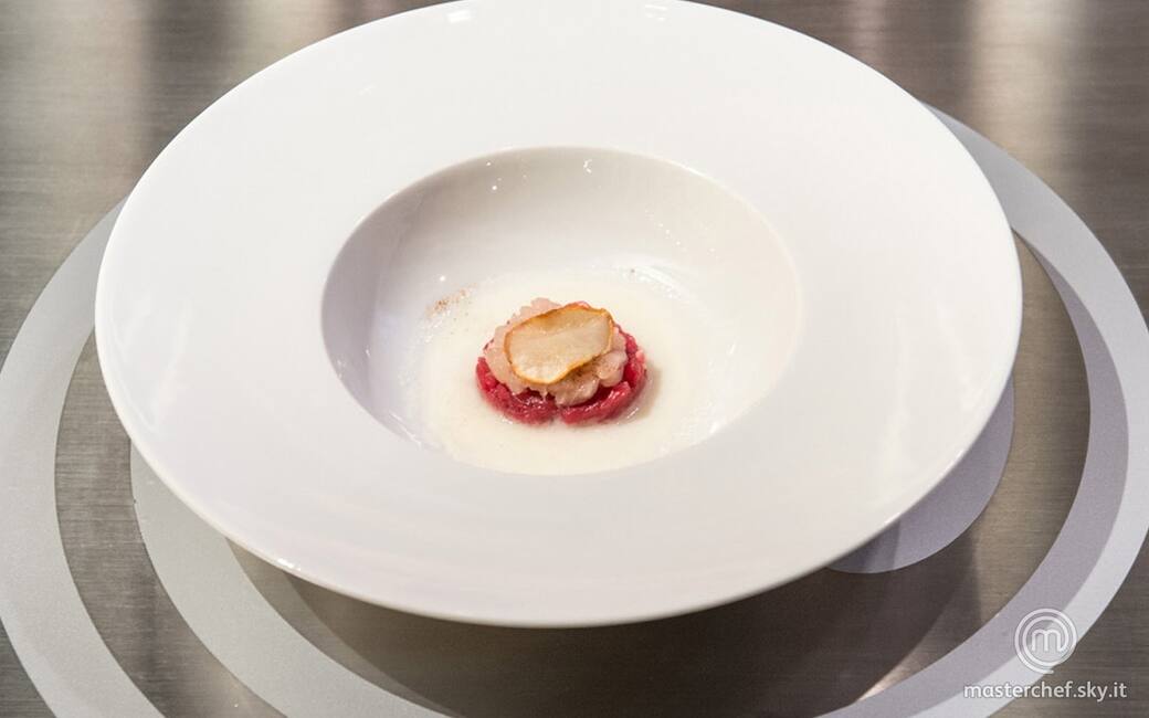 Impiattare posizionando in un ring la tartare di manzo, in un ring più piccolo la tartare di trota, da posizionare sopra la carne, le chips di topinambur e la crema, da versare accanto alle tartare.