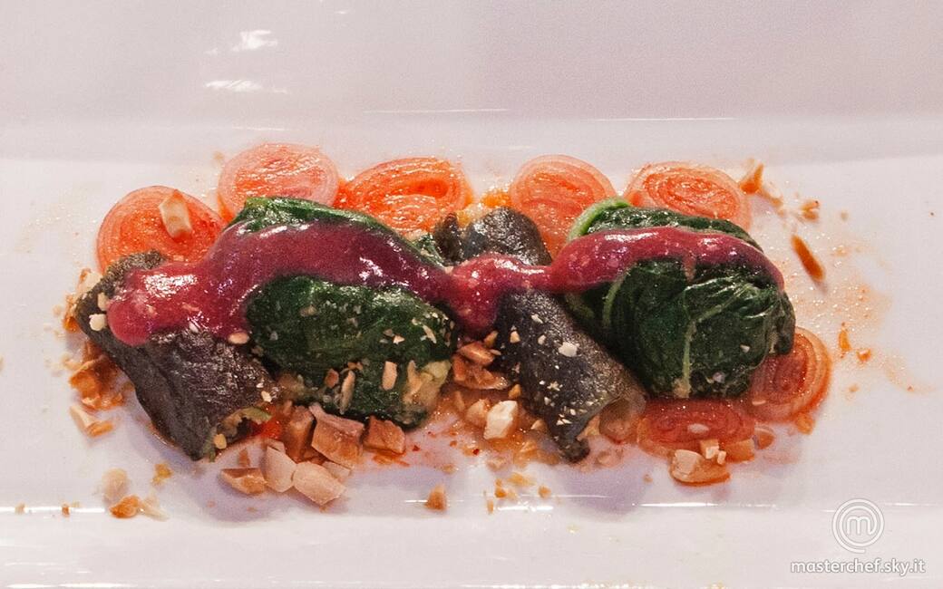 Realizzare degli involtini con la pelle dell’anguilla e con le foglie di borragine ripieni di un composto di una parte delle mandorle, la crema di fave, quattro cucchiai di kimchi e i tranci di anguilla tagliati in piccoli pezzi. Ripassare in padella gli involtini con un filo di olio evo e rosolarli su ambo i lati.