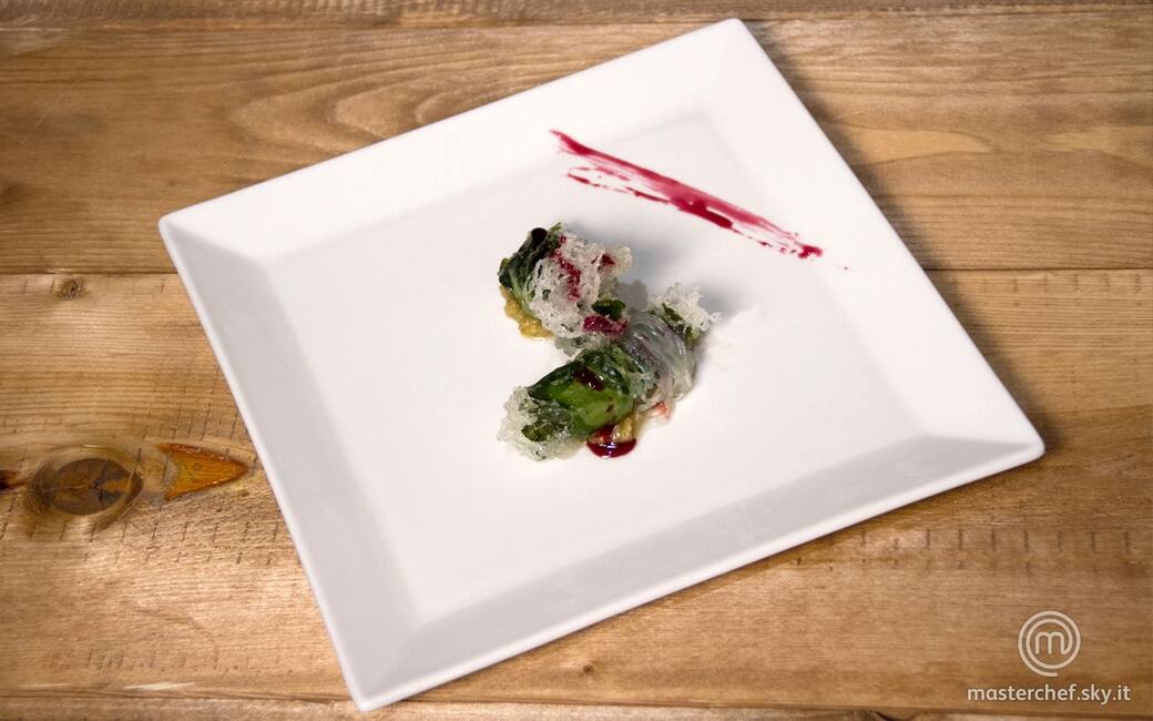 Cospargere con il trito il filetto di orata, salando a piacere. Realizzare l’involtino avvolgendo il filetto di orata con un pezzo di foglia di bietola e 7/8 noodles. Friggere l’involtino nell’olio di semi bollente. Mettere a riposo su carta paglia.