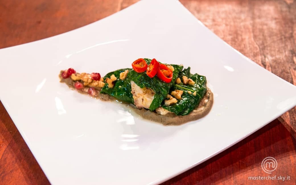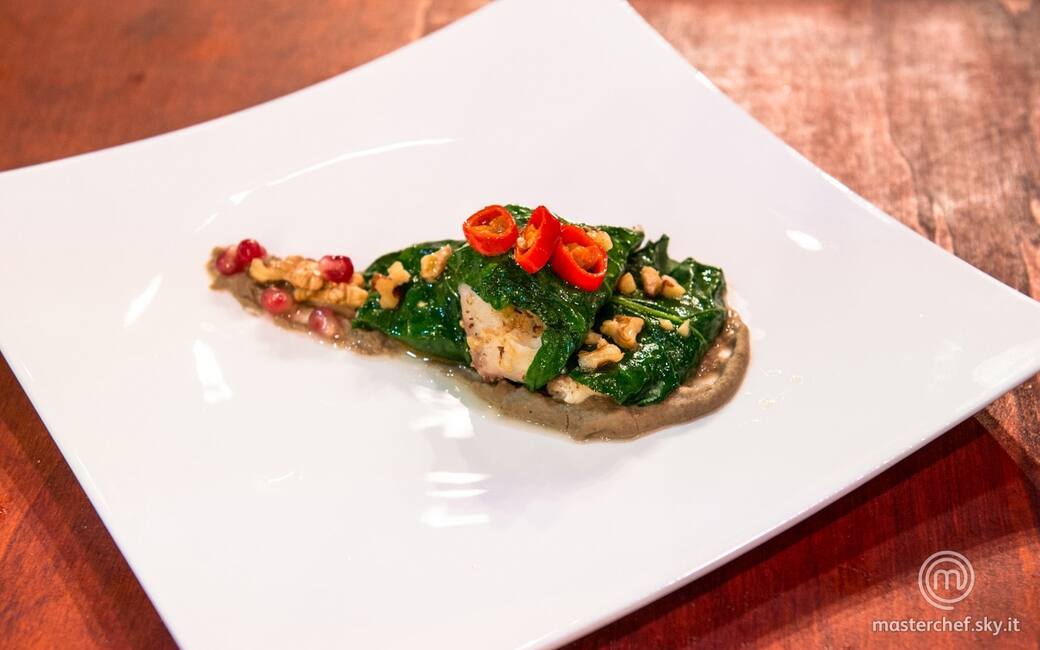 Avvolgere i filetti di orata nelle foglie di bietola e impiattare, posizionando prima un letto di crema di lenticchie e poi gli involtini. Guarnire con noci tritate, chicchi di melagrana e qualche rondella di peperoncino.