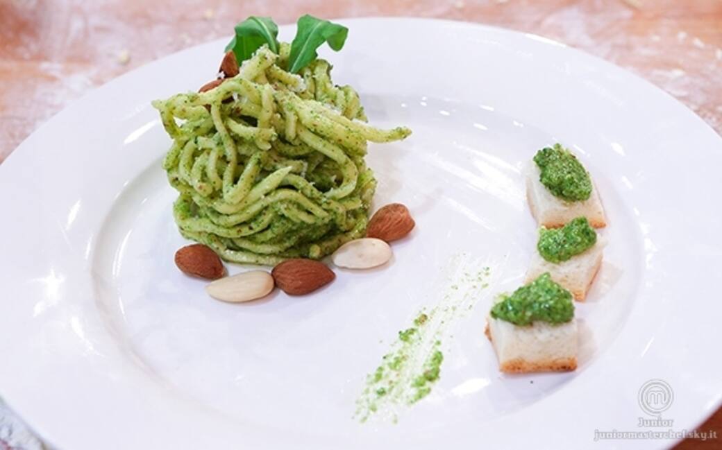 Impiattare con un coppa pasta e decorare con qualche foglia di rucola, qualche pinolo, qualche mandorla e scaglie di parmigiano. al lato affiancare dei cubetti di pane precedentemente tostati con qualche goccia di pesto.