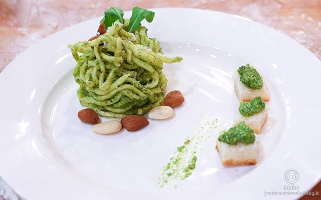 Impastare farina e uova e lasciare riposare qualche minuto; nel frattempo mettere a bollire l'acqua per la pasta. in un mixer frullare la rucola, le mandorle, i pinoli, il parmigiano, il pecorino e l'olio.