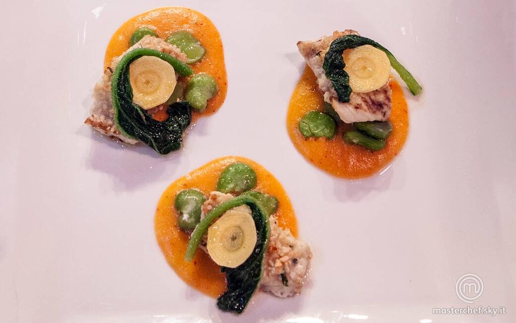 Impiattare disponendo la crema di patate, le fave novelle, il trancio di anguilla, il carpaccio di carote e una foglia di borragine. Aggiustare di sale e pepe.