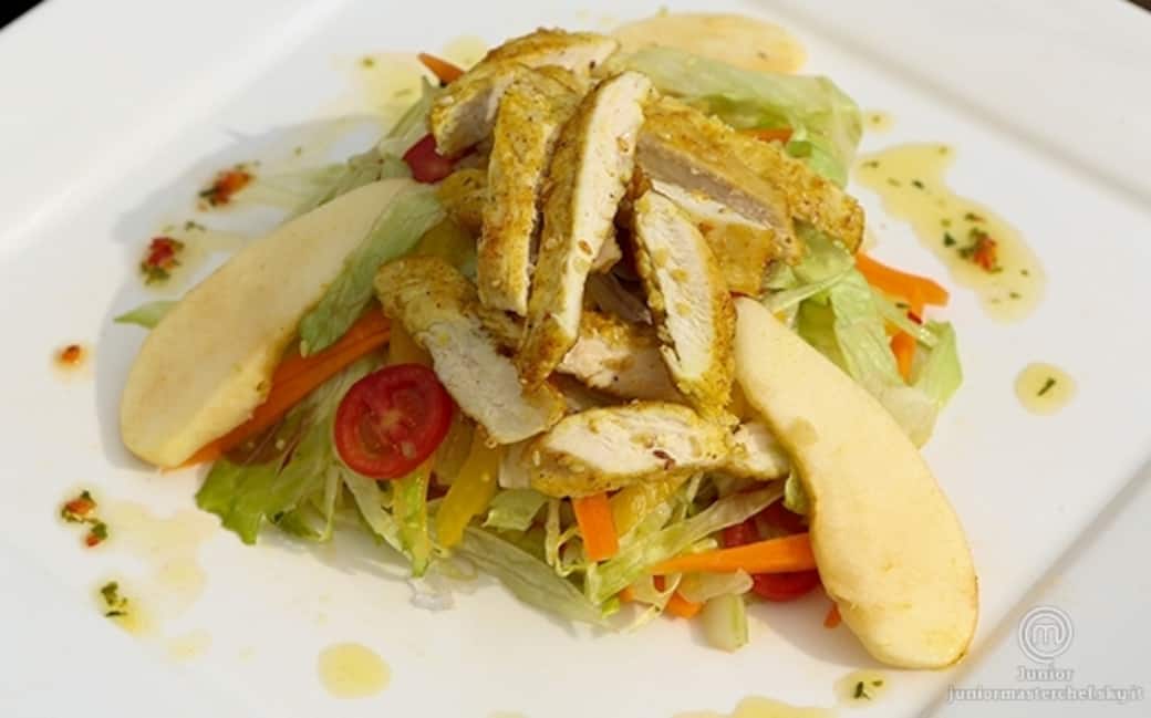 Tagliare il pollo a meta e cospargerne i due petti con un po' di curry, sale e sesamo. riscaldare la padella antiaderente con un filo d'olio e appoggiare i petti di pollo e farli cuocere per 4-5 minuti, girandoli ogni tanto. una volta cotti, lasciarli raffreddare. lavare e mondare la carota per poi grattugiarla; tagliare i pomodorini e la mela a spicchi. tagliare il pollo a listarelle, mischiare le verdure insieme a un po' di insalata iceberg sminuzzata. aggiungere infine anche i petti di pollo e le verdure, condire con una spruzzata di succo di lime.